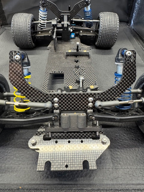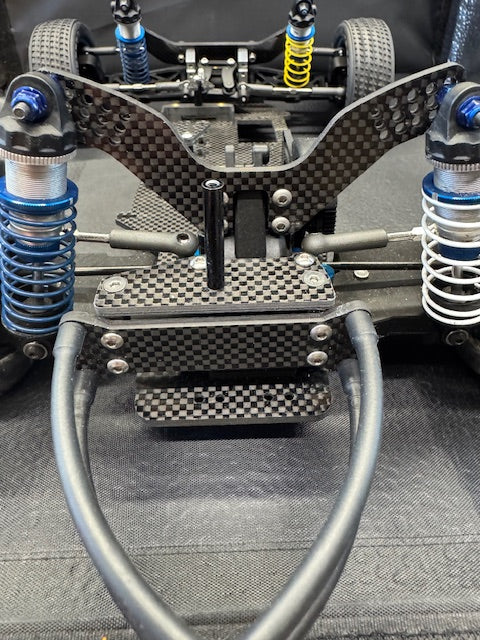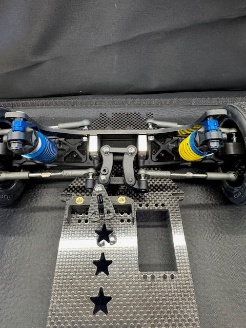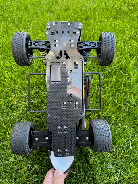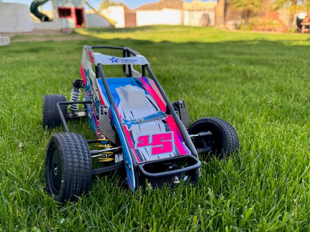 FIVE STAR HOBBIES NINJA DIRT OVAL MIDGET CONVERSION KIT. INCLUDES ALL PARTS NEEDED TO CONVERT EITHER A DONOR TEAM ASSOCIATED B6.1 UP TO B6.4 TWO WHEEL DRIVE BUGGY OR USE A BUILDERS SUPPORT KIT.. FRONT AND REAR OFFSET OPTION AS WELL AS WHEELBASE OPTION ARE ADJUSTABLE USING PATTERNS ON THE CHASSIS. FIXED ANGLE 2 PIECE REAR ARM ASSEMBLIES INCLUDED IN THE KIT. CAGE SCREWS DO NOT NEED TO BE REMOVED TO RELEASE THE CAGE AS THE MOUNT AREAS ARE SLOTTED AND FRONT SLIDES INTO A RECIEVER IN THE FRONT END, MADE WITH 3MM CARBON FIBER. CAGE AND BODY ARE INCLUDED AND USES THE GFRP CAGE AND BODY ASSEMBLIES
